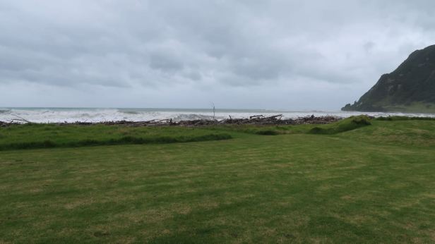 There was nowhere to hide, no café was open, so we just went on. In the end, we did finally encounter a café, which was marked as a shop and gas station, in Te Puia Springs. The lady on the till gave us some coffee and told us that what we were experiencing “only” the tail end of a cyclone that had been ravaging the area for some days – and that we would be in it as far as our ultimate destination, Gisborn. While we waited for the monsoon to abate to a mere deluge, Lucie opened her local weather App and stared in horror at the blue, green and orange snail of the cyclone, which lay exactly above our route. She remembered the cheery young guide in Hobbiton and said to me “This is the cyclone and we are right in it !“