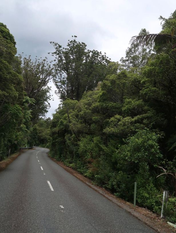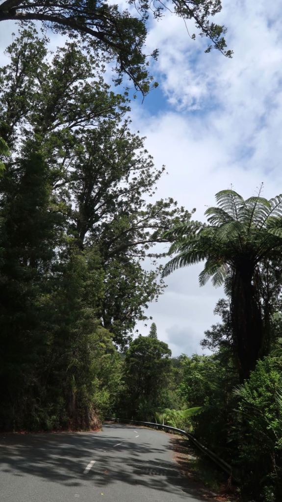 The landscape was again beautiful, but in a completely different way from that of the previous day and we were soon glad that we had not cut anything out. We drove most of the way on empty and relatively flat roads. After leaving Omapere, we came across the top of the hills and descended through the Waipoua Forest. This was a scenic bonus for us both and a botanical bonus for Lucie. The twisting road, for aesthetic reasons mostly devoid of the bright yellow signs that preceded most bends elsewhere, wound its serpentine way through a tight tangled mass of trees. It was like being in the jungle. Many of the trees were of the Kauri type. This tree, which has a strange life-cycle, is native to New Zealand and, whilst still abundant, suffers from what is called “die-back” which has hit the population hard. Signs everywhere urged people only to enter the forest with clean boots to help prevent the further spread of the die-back disease. We passed a place where we could have gone to see Tane Mahuta, the largest known living Kauri tree in New Zealand, but as ever, time was pressing. We rode on without stopping, but the route through the forest was a most pleasant experience.