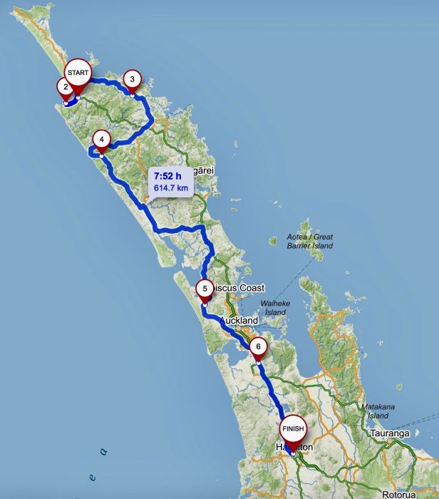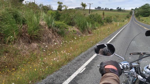 Did I mention the ducks earlier ? At that point those ducks became pigeons – and a cat was lobbed neatly amongst them. Just south of Kaitaia, the highway south was totally closed for repair and we had no option but to trek back north again (to the fateful T-junction in Awanui) and take a detour back around the the loop past the Bay of Islands. I tried not to look at the BP garage as we passed it. It was a nice morning and it was a pleasant ride through rural countryside, but we had already seen it.