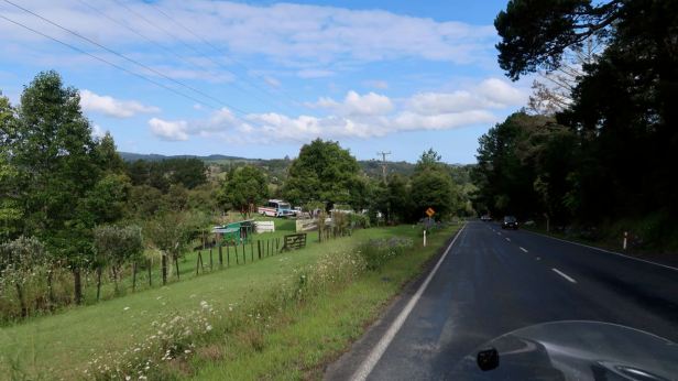 Our course again brought us back to the SH1 at Wellsford. We again had to decide whether to just ride south on the highway and go straight through Auckland to Hamilton, or to turn westwards again towards Helensville and drive a little further along the coast. Of course we turned west, justifying it by the fact that there would be what passes for an afternoon rush hour on the highway anyway and it probably take no more time to go the longer route.