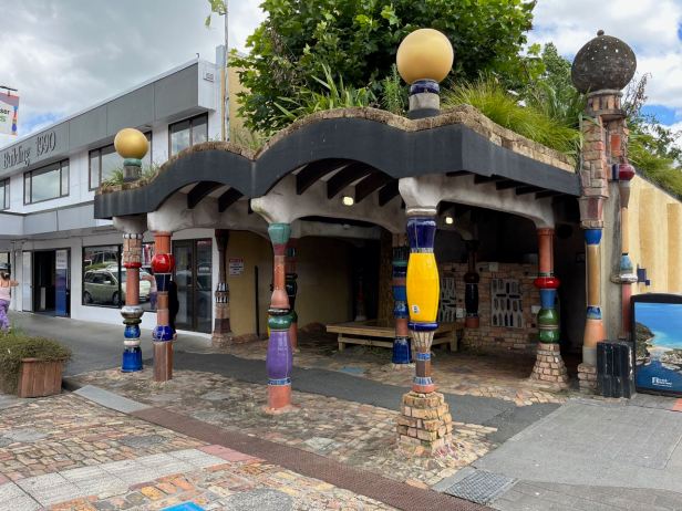 When we reached the sign for Kawakawa, we saw a sign saying “Hundertwasser Toilets” which amazed us. We are big fans of the works of the Czech/Austrian artist Friedensreich Hundertwasser (see other pages on this site for Germany and Austria). We had never had an inkling, in all of our research, that his works could be seen in New Zealand. At the start of the city limits of Kawakawa, even the sign had the familiar facets of “Hundertwasser” style.