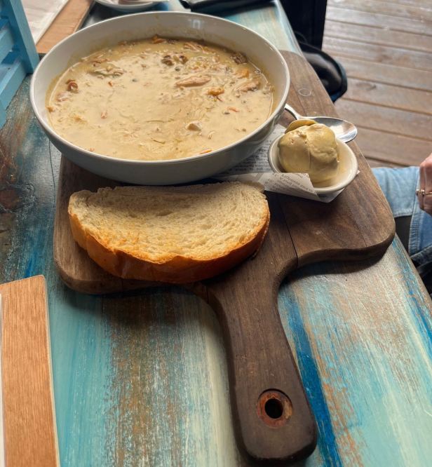 We were both hungry, breakfast was already a distant memory and it was clear from the maps that the next decent café was a long way off. We both had fish chowder with homemade bread and butter which was really delicious although the only alcohol free beer they had was the seemingly ubiquitous Heineken 0. Nothing wrong with it – but not much right either.