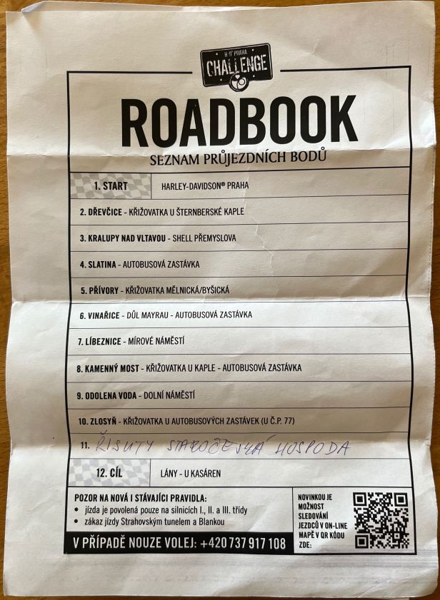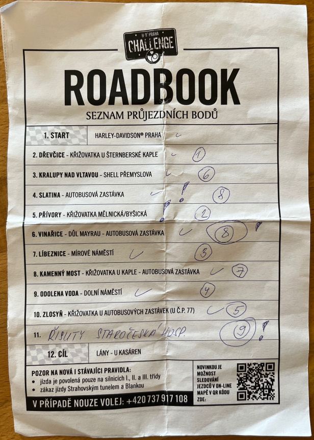 To keep things exciting, one point on the “Road-book” is NOT pre-printed and Jarda Vavřína, the Harley dealer, selected a victim from amongst the competitors to draw the final point from a selection of four that were in a crash helmet.