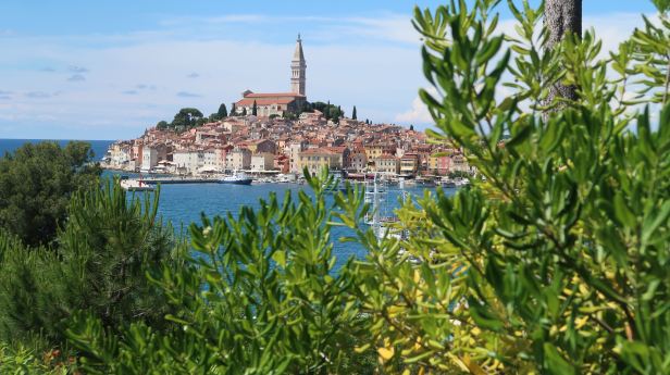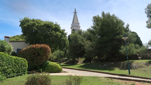 Approaching the sea, as we did, down a narrow and fairly precipitous street, we were treated to a sight of the “Crown Jewel” of the Rovinj Old Town, the sixty metre high tower of the Saint Euphemia church. This was neatly framed across the bay and towered above the red tiled cone of roofs that forms the Old Town, which is built on a small round hill.