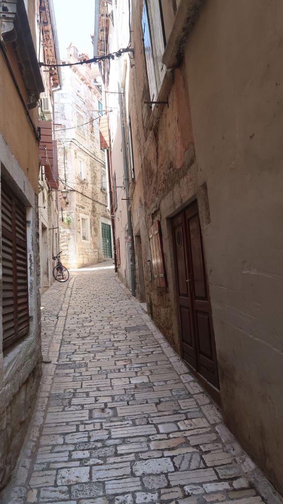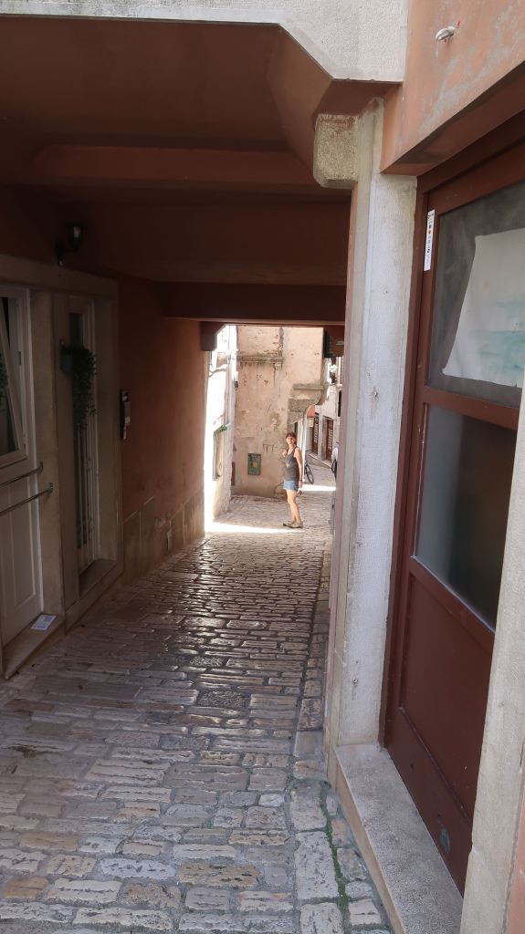 There were a few mature trees, but we suspected they were more likely “legacy” items as most of the planting seemed fairly recent in botanical terms. I previously described Pag as being a town “on the up” and, by that standard, Rovinj is quite a lot further up the gradient. The park was the home to not just one, but to four, of what can only be described as top-notch hotels. They were all the kind of magnificent places made of concrete and sun-dim dark glass, with shaded parking and electric carts to move guests around the grounds. Not the sort of places that Lucie and I would ever want to stay, but we accept that there are those that would. I wondered if the doorman would keep his composure if we trundled up to the entrance on our dusty Harley-Davidson !