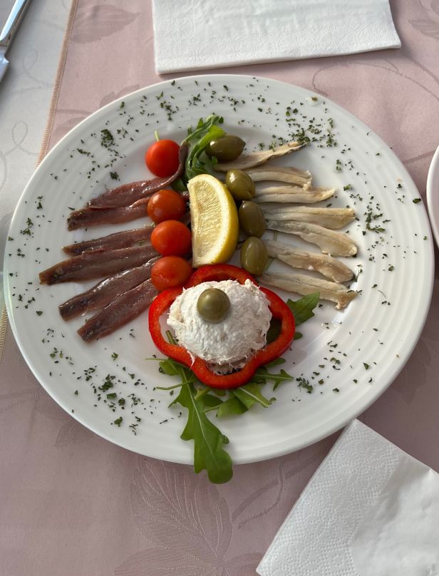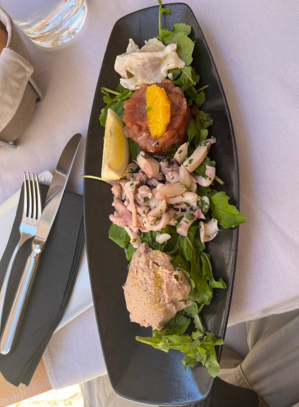 It was, by then, lunch time, so we decided to have a little something to eat. I have to say that prices were on the premium side. We are not mean, but things were at least 50% dearer than anything we had thus far encountered. Still, we were there, so we chose a place called Balbi (Ulice R. Devescovija). It was on two sides of a narrow street and our table was perched, a little precariously for someone as accident prone as I am, on some sloping cobbles. The food, however was good. We shared a starter of various fishy things and the service was attentive.