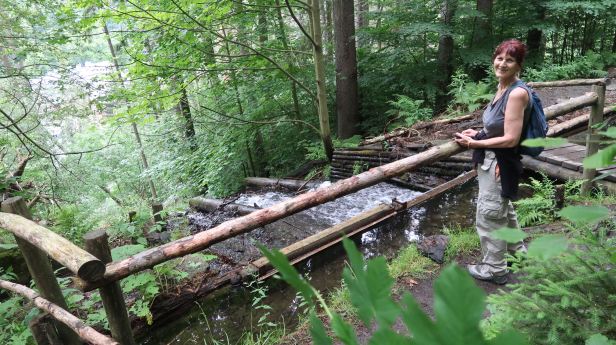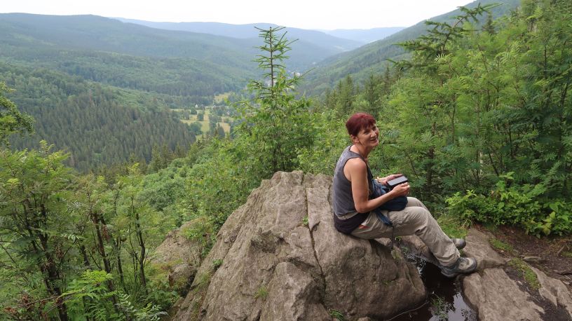 We crossed a road and followed the steep hiking track up into the forest. Far below us, on the easier walking of the road, we could see our erstwhile companions, strung out in a long line along the roadside. In time, we came out of the trees, to re-cross the road and, surprise, surprise, the vanguard of the church group was already at the edge of the next part of OUR route, chatting and waiting for the rest to catch up. We quickly started down the forestry road, but soon branched off in order to take the hiking path to a lookout point called Rolandův kámen. This was a high outcrop of rocks where it was only possible to start the ascent with the aid of a wooden stairway.