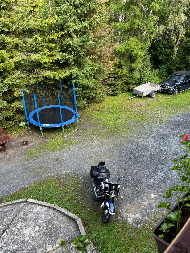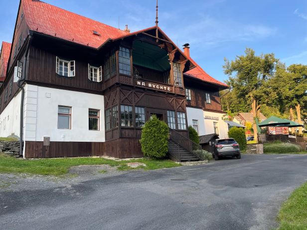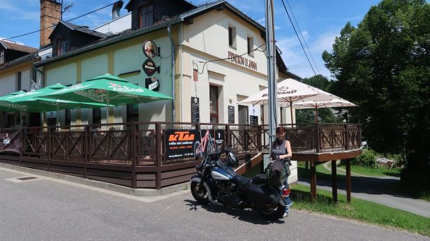 We had booked three nights in the Pension Lukaš (Mála Morávka ev.c 16, Mála Morávka). We found it by using its clearly indicated direction boards. The SatNav disagreed, but I had entered a slightly incorrect destination. If you ever have a lot of time with nothing to do, Lucie will happily explain the difference between a ČO (číslo orientační – the red number), a ČP (číslo popisné – the blue) number and an Ev.č (evidenčí číslo – any colour except red or blue). Anyway, after a slightly traumatic ascent up a steepish, loosely surfaced, slope on a loaded Harley, we arrived at our destination.