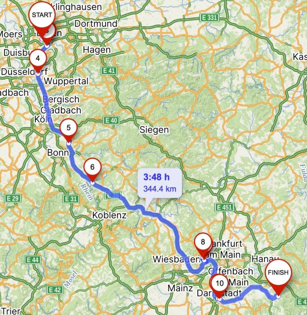 The route was almost entirely motorway as we headed first across the Wuppertal region on the A52 and then towards Leverkusen, Bonn and Köln (Cologne) before turning south towards Frankfurt-am-Main on the A3. As ever, there was not much of any real interest to see, although there has been a steady increase in the amount of nearby railway infrastructure in the many years that I have been driving that road. Some of the flyovers and cuttings that smooth out the progress of the railway line in that undulating area, are impressive indeed.