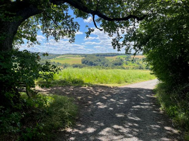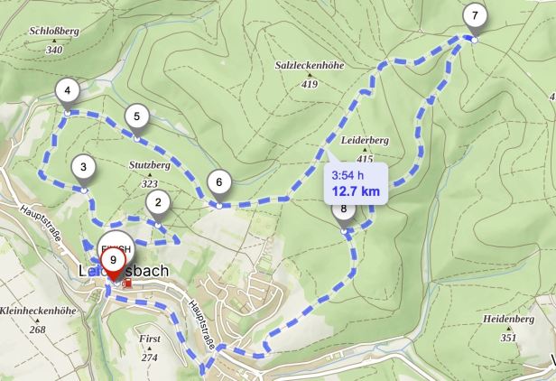 The way-marking used in Germany is different to that at home, but the tracks showed up on Lucie’s Czech map program so we strode with confidence up a gravel track and into the woods. We soon had a good view back over Leidersbach, which was revealed to be strung out over quite a few kilometres along the valley floor with a few incursions towards higher ground. We could see our lodgings, already far below and the modernish, brick-built church was clearly visible. There were various stations of a “Way of the Cross” along our initial route.