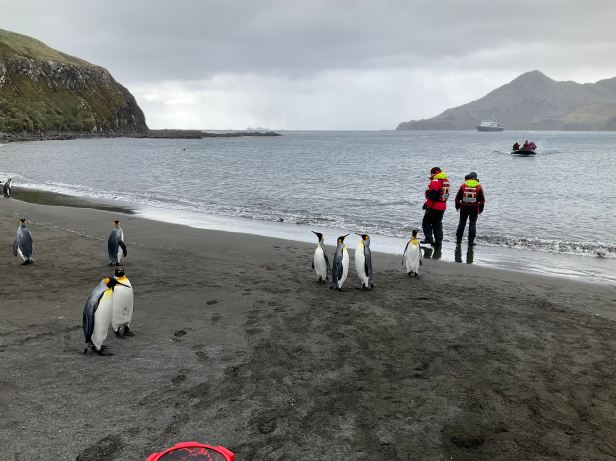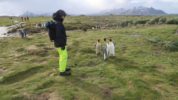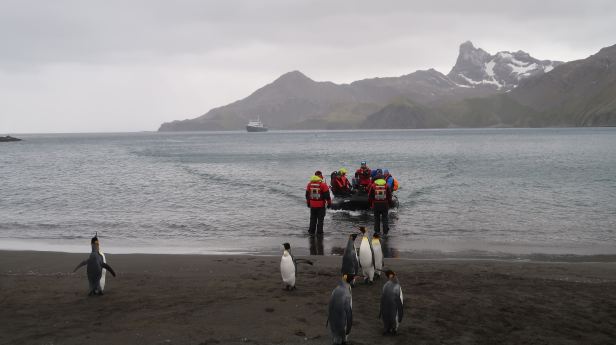 The call came and we togged up. We were getting better at it, so it did not take long. I even put on an extra layer and then we joined the slow shuffle towards the gangway. The sea was surprisingly smooth, but there was a fierce wind whipping across the surface. It is hard to describe exactly how I felt as we droned across the bay. There were snowy peaks on all sides and it was already possible to discern King penguins and Fur seals all along the approaching tide-line.