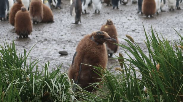 The main King penguin colony, however, was on the beach and slopes to the south and this ran into the tens of thousands. It was a veritable sea of black, white and orange. There were youngsters of various ages in different stages of moulting. These ranged from the brown, downy fluff of the chicks to the older, but still not mature birds, having their final moult before achieving adulthood. All around was the trumpeting and braying of various birds.