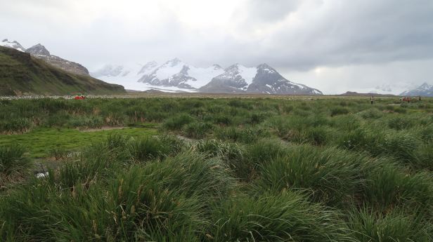 We landed without drama. It was amazing just how quickly climbing into a small dinghy, in what we would previously have thought were slightly risky conditions, had become commonplace. The terrain was a bit different to that of the first landing. The plain was a lot greener than Right Whale Bay had been, with Tussock grass in the distance. Only the awesome backdrop of mountains and glaciers was the same.