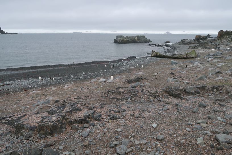 Our intention was to hike to the glacier to stand in some snow – and it was quite a hike on a difficult and pebbly terrain. We passed the large (and smelly) Gentoo colony and came to a extensive area of what may well have been glacial moraine. It was a huge expanse of rough, broken rocks. At the far end, the snow of the glacier gleamed brightly white.