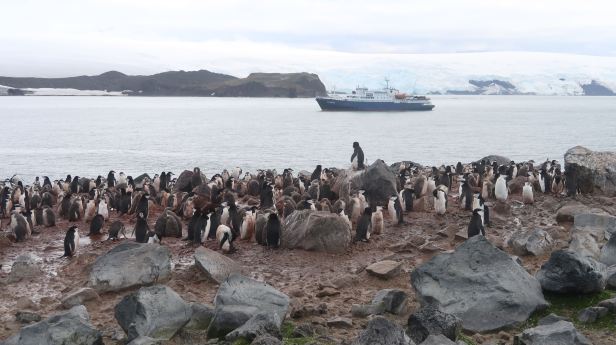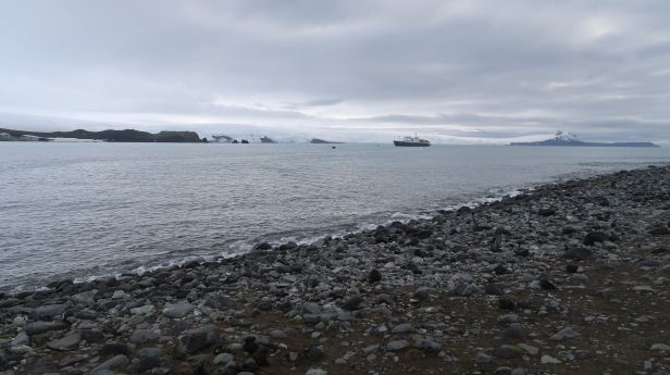 We woke early and, in the pre-dawn gloom, it was just possible to make out shapes that were not icebergs on the Starboard side. As it grew steadily lighter, the Plancius slowed and by then, on the Port side, the extinct volcanic cone that was Penguin Island came into view. The sea was placid, so the landing would happen.