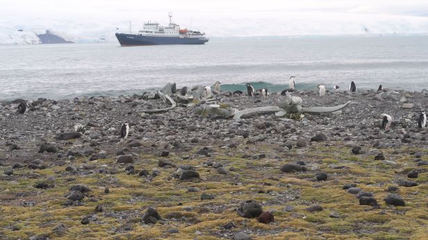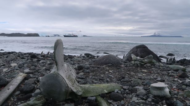 On the top of the beach it was far smoother and we walked along whilst Chinstrap penguins hopped comically from rock to rock, interspersed here and there with the odd Gentoo. A whale had obviously met its fate of some kind on that strand, there were large bones everywhere, including some massive vertebrae.