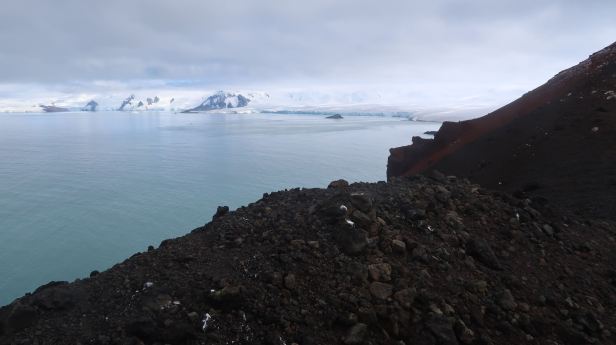 There was the opportunity to climb the volcano and hike around the rim. The sun was fully out by then and it was rather warm. I was glad that I had resisted the temptation to put on too many layers. On the slopes, we found a couple of places where there were piles of egg shells. The Chinstrap penguins, as I noted somewhere earlier, lay two eggs – and then abandon the first. Nothing goes to waste in those parts and the skuas steal them, smash them on rocks and eat them.