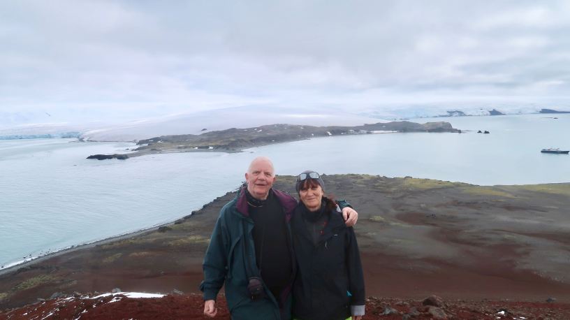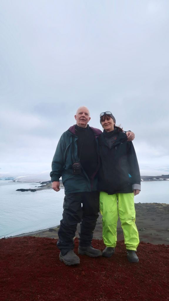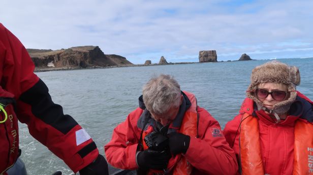 Actually getting into the Zodiac was a roll of the dice. One or two people just hopped in as normal, others had to wait for the Zodiac height to match that of the gangway platform. The boarding procedure was that the guy at the bottom of the gangway held your arm in a “seaman’s grip” (mutual hand to wrist, to allow minimal slippage) and the guy in the Zodiac did exactly the same thing with your other arm. You then put your first foot on the tube, your second on the step and, hey presto, you were safely in the boat. It usually worked well and felt secure. Of course, when my turn came, no sooner had both my wrists been grasped, than the swell dropped the Zodiac like a stone – and away from the gangway. For what felt like an eternity, but was probably only two or three seconds, it was MY body that was holding the Zodiac to the Plancius – whilst I stared at what seemed to be an ever widening gap above the heaving brine. Then the Zodiac came up and in I stepped a little shakily aboard. Knowing my tendency for self-harm, Lucie was a bit pale, but I am laughing about it …… NOW !