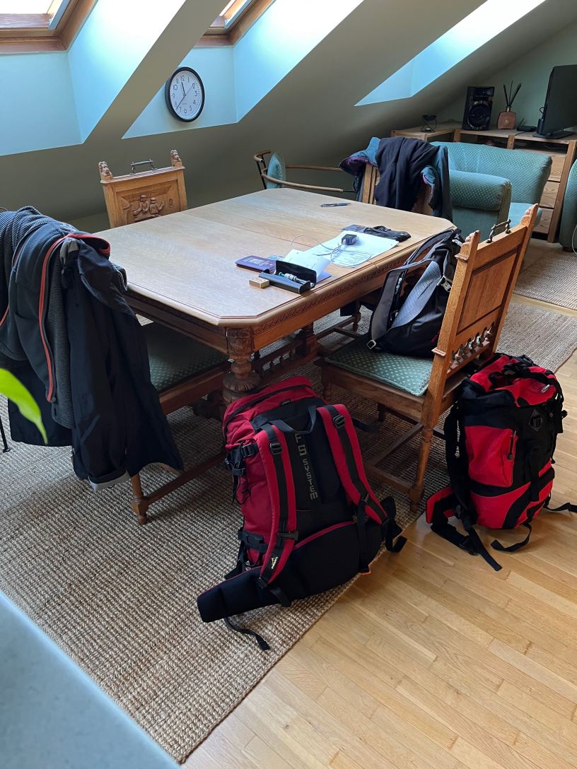 Because our first flight, to Madrid (where I wrote this) was not until the early afternoon, we had time to kill, which actually meant time to start fretting. Thanks entirely to Lucie’s hard work, all the stuff we needed was laid out on the table in our apartment. Lucie packs what I call “Motorcycle light” and although I knew she had comprehensive lists for all our travel “modes”, there did not seem to be very much stuff. When we weighed them, our two rucksacks each weighed seven and a half kilograms – but, of course we had just over an additional three kilograms of toiletries and electronics in a little hand-bag. A quick bit of juggling was required to ensure that neither exceeded the ten kilogram limit for hand-baggage on our various flights when the small bag would be placed into one – and was skilfully achieved. I could easily lift one in each hand at the same time.
