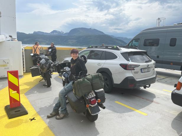 Within a few moments we were boarding. A Norwegian dual sport passed me as I moved onto the ramp and bagged the front spot, curses ! The ferry moved off within minutes and was almost totally full. Where did all those vehicles materialise from ? It was so smooth, that it was almost impossible to feel it moving.