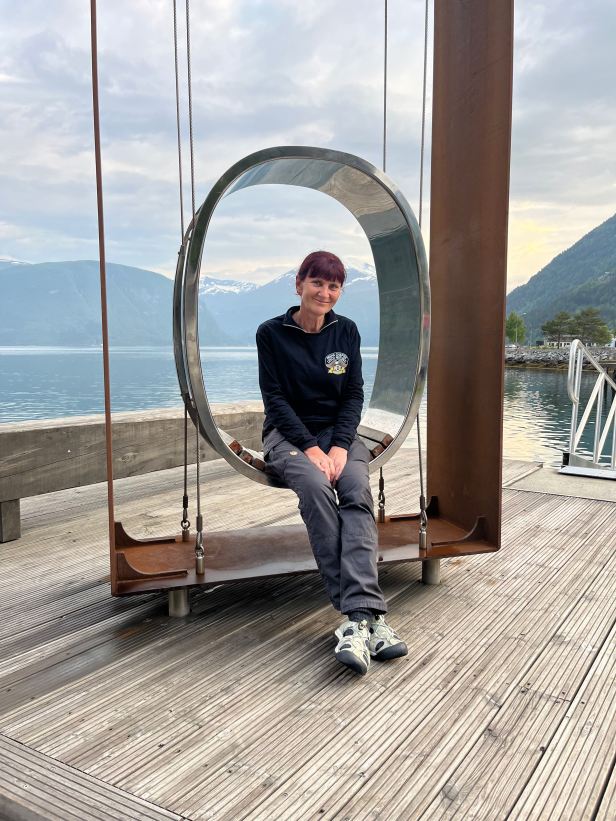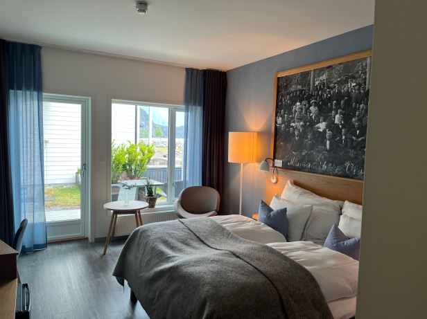 I have been raving a bit about our accommodations, but this one was a complete corker. The Valldal Fjordhotell, in Sylte, was as modern and stylish as it is possible to imagine. Sitting on a small promontory, the single storey building, with a two storey high central reception/restaurant area, was surrounded on three sides by water. Two of those are the Norddalsfjorden fjord and the third was a rapidly flowing and wild looking river, the Valldola, that comes straight from the mountains above the small town. Even in dull weather, it looked idyllic.