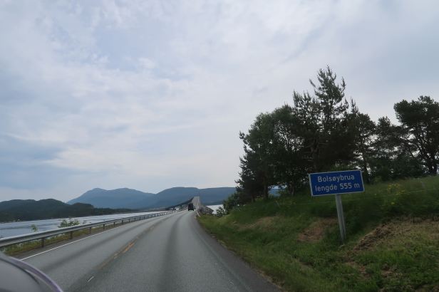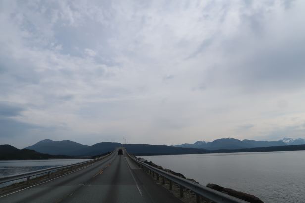 We plugged on. Because of the topography, there were a lot of tunnels. That same terrain meant that we would sometimes enter a tunnel in a downpour and emerge into dryness – and vice-versa. Variety, as they say, is the spice of life. Progress was slow. Such was the previously mentioned winding character of the roadway that knowing in which direction you are going at any moment is impossible. The only constant was that it was forward and, at least theoretically, nearer to where we were going – at least as regards to the road. It is a shame that the weather was so bad. My trusty photographer mainly kept the camera out of the deluge, but she did manage to capture a long, but eclipsed by those on the Atlantic Highway, bridge at Vikebukt which swept majestically right over an inlet of the sea and put us softly down on the other side.