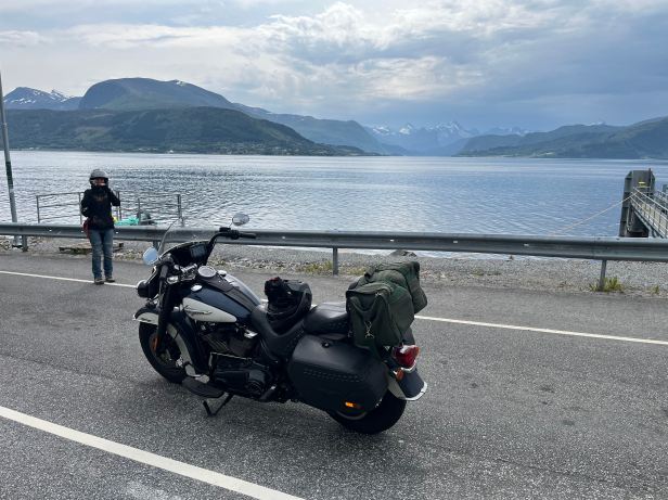 When we went to check-out, it transpired that quite a number of our fellow guests were also bikers. The country of Norway is a bit of a biker’s paradise and there were a lot of them in the lobby and others outside loading up their bikes. They were almost exclusively of the enduro/dual sport type and when I walked round and fetched the Harley from the car park, it attracted a lot of comment.