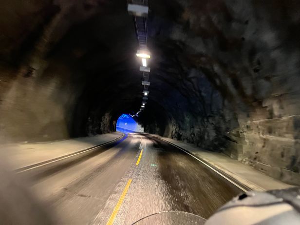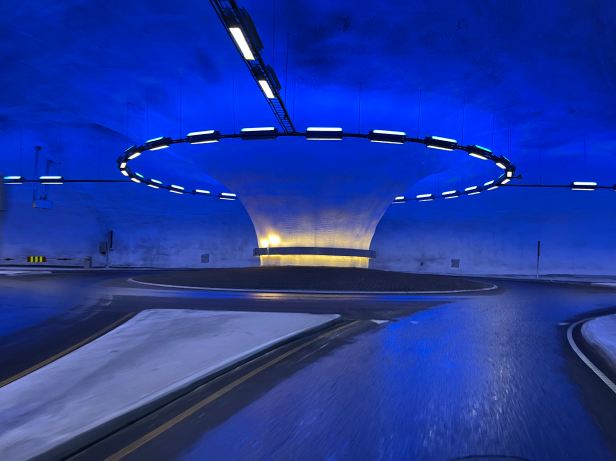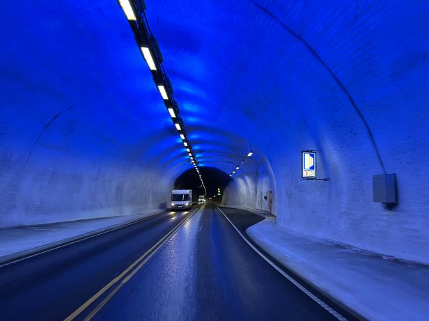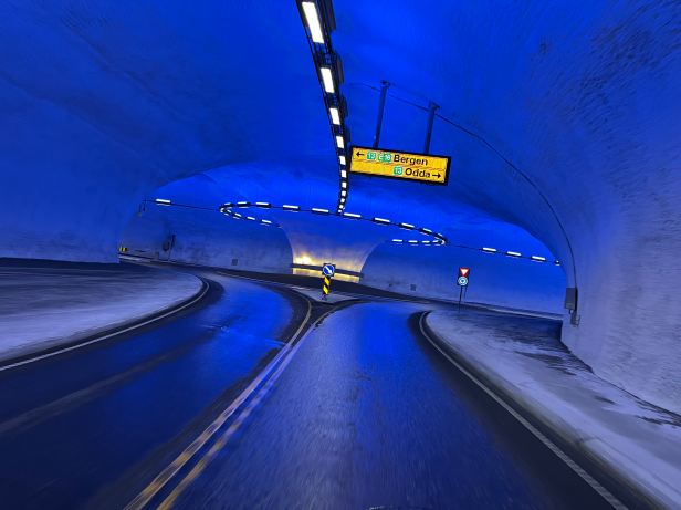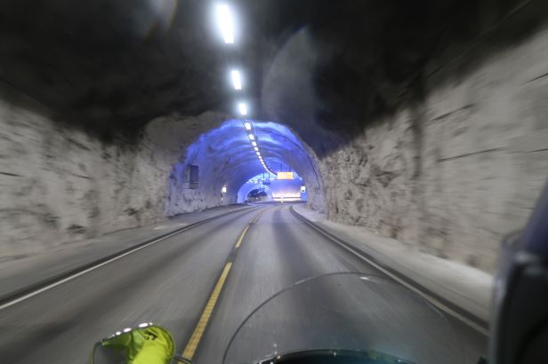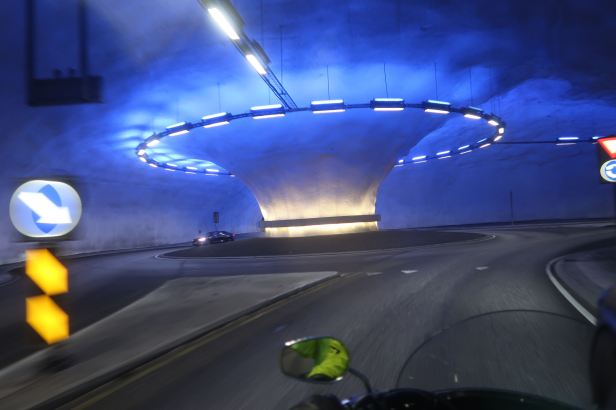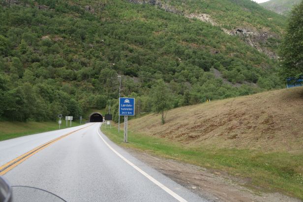 Straight after a roundabout, we came to what it later transpired was the “Big Daddy” of all the tunnels we had thus far encountered – and, I subsequently discovered, the longest tunnel in the whole world (at time of writing). This was the 24.5 kilometre long Laerdal tunnel which connects the municipalities of Laerdal and Aurland. It even had a sign, deep inside, telling you when you changed municipality ! It is a strange thing to be underground for so long, the walls and lights can be a bit mesmeric. To counter that, there were wide, blue-lit plazas at the six, twelve and eighteen kilometre marks to change the aspect.