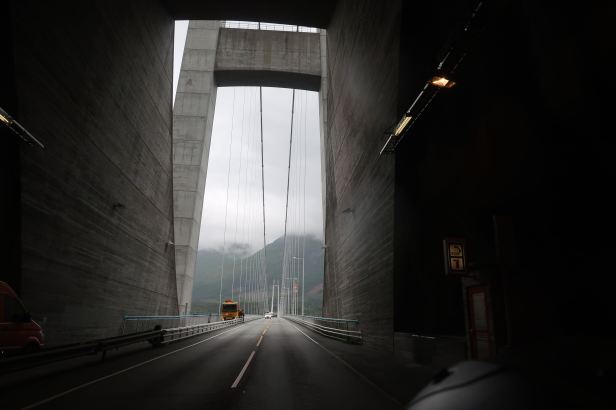 On the other side, the bridge disgorged into yet another tunnel where another subterranean roundabout offered the option to continue south, or to branch off via another elegantly curved tunnel which emerged above the suspension bridge. We took this and it carried us in the direction of Eidfjord.