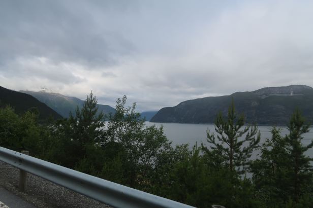 Eidfjord was “hosting” (if that is the word) an enormous ship on a fjord cruise. The town was a bit cheesy to be frank, with knitted stuff garlanding the trees along the waterfront and a plethora of souvenir shops. The streets were thronged with people whose clothing and actions trumpeted the fact that they were, as they say, fresh off of the boat. We drove through without stopping in the town, but we did halt briefly for a tiny lunch of buttered pitta bread that we had saved from the Greek salad, in Mama Mia, the previous evening. The first food of the day, it tasted gooooood !