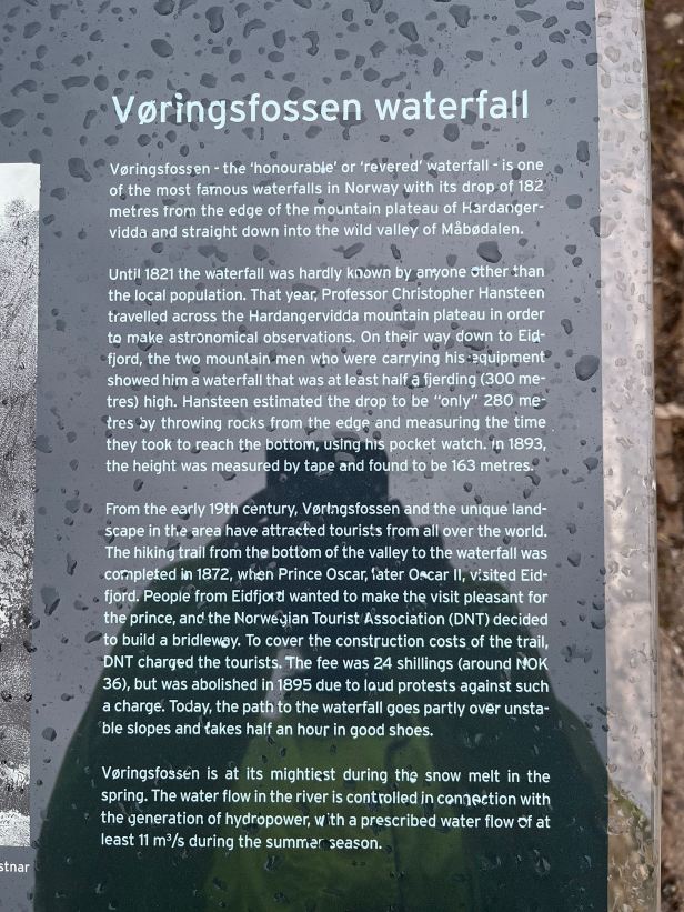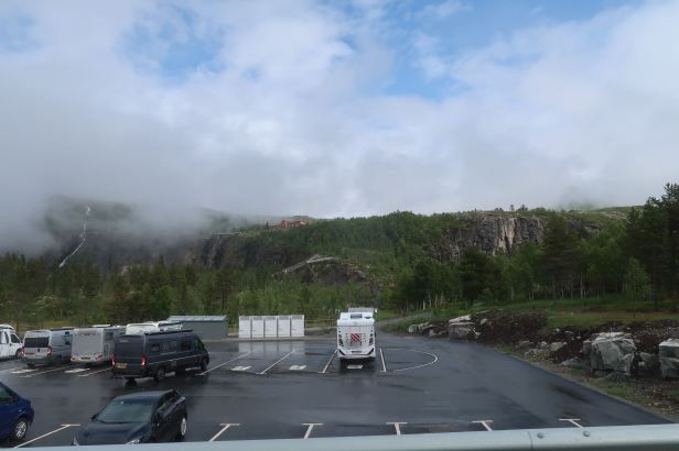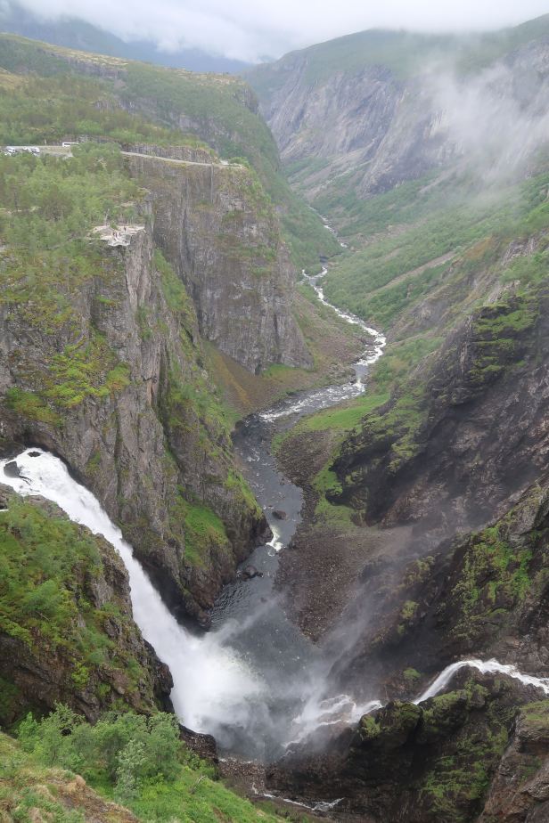 We were nearing our second set of waterfalls, the Voringfossen, by then but, before we got there, the art of the tunnel builders was raised by yet another notch. First we entered a tunnel that, by its length and curvature made, by my estimation, a double loop in a long climb. Then we popped across a short straight and into the next mountain, where the whole thing appeared to happen again…. We then still had to make a still significant climb up a twisty road before Lucie directed me into the upper parking area for the Voringsfossen waterfalls.