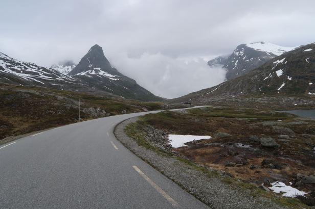 I said to Lucie that what we needed was a bit of wind. Maybe God, or one of the scary Norse ones, was listening again, because the wind rose almost immediately. In literally a few seconds, the whole of the roadway, from its distant ingress at the bottom of the pass to the crest, a few hundred metres away to our left became visible.