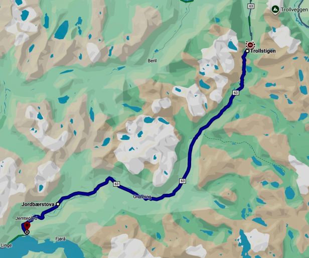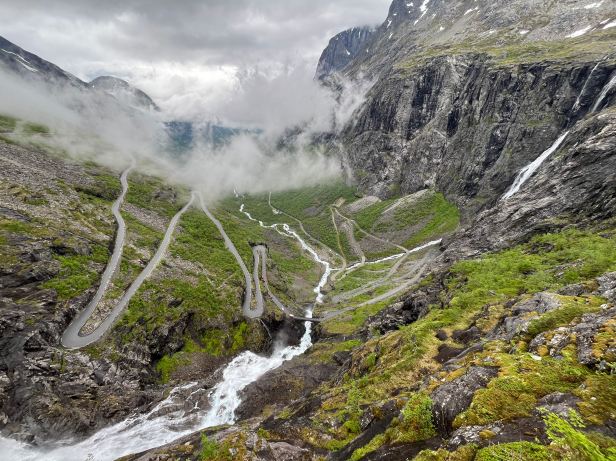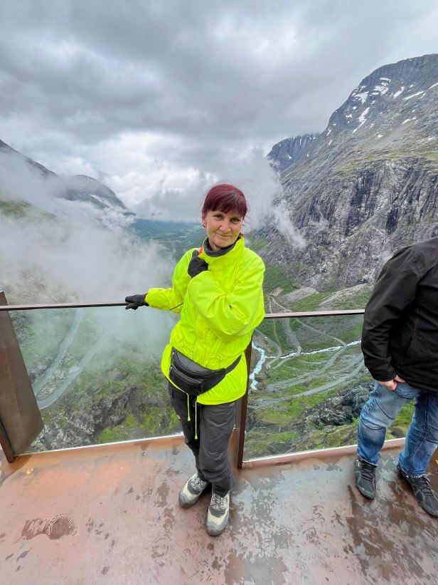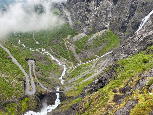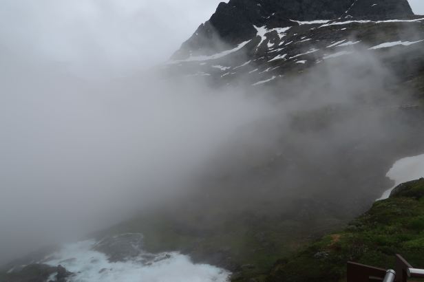 Our plan for the day was to try and visit at least the top of the pass at Trollstigen. We understood that the blockage caused by falling rocks was somewhere on the serpentine itself and that the visitor centre at the top was still open. That was only about forty kilometres away, so there was no real urgency. We were also entertaining the idea of a hike of some sort, at the top, because there was a marked route. That would depend upon external factors like the weather – and outside of our window it was raining merrily.