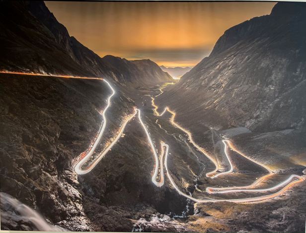 Then we returned to our hotel. In the corridor outside was a time-lapse picture of a vehicle ascending the Trollstigen pass on a clear night.
