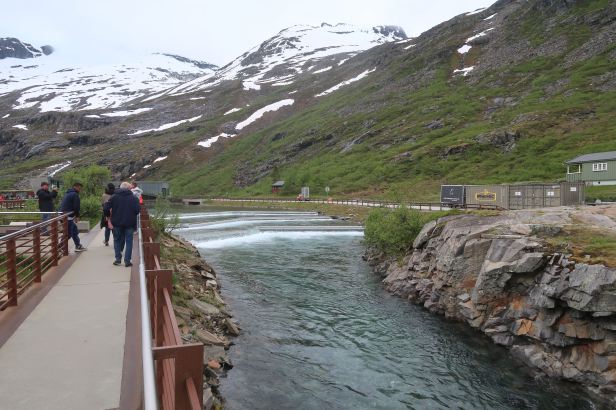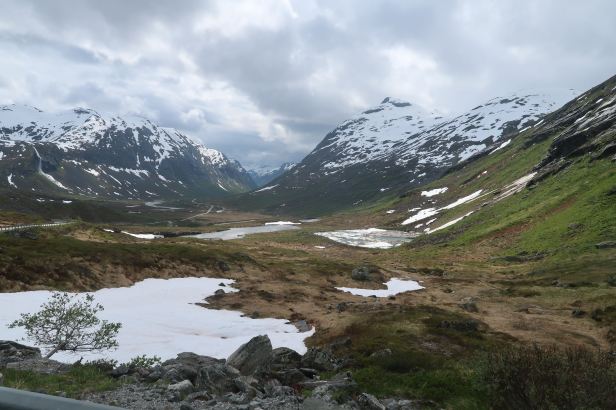 At the top of the pass there was an impressive visitor centre in the typical modern Norwegian style of angled concrete and glass. There were a lot of people. We had followed several coaches up the slope and these disgorged a couple of hundred passengers from some fjord cruise. It was the sort of outing where the folks were all wearing a sticker with the number of their bus, in case they somehow forgot it, if you get my meaning. They milled like lost sheep until the guide appointed for their designated bus rounded them up, sheep-dog like and herded them in the right direction !