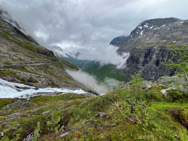 Our plan for the day was to try and visit at least the top of the pass at Trollstigen. We understood that the blockage caused by falling rocks was somewhere on the serpentine itself and that the visitor centre at the top was still open. That was only about forty kilometres away, so there was no real urgency. We were also entertaining the idea of a hike of some sort, at the top, because there was a marked route. That would depend upon external factors like the weather – and outside of our window it was raining merrily.